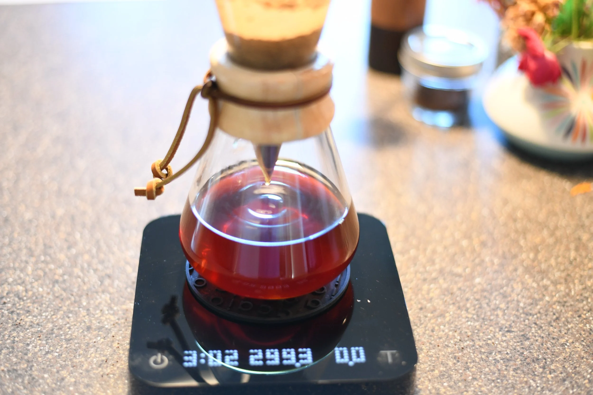 Lovely color in the hand-blown Chemex (pronounced “sha-may”). 50g of 200 degree fahrenheit water to bloom, 100g more on second pour, 150g more on third and final pour.