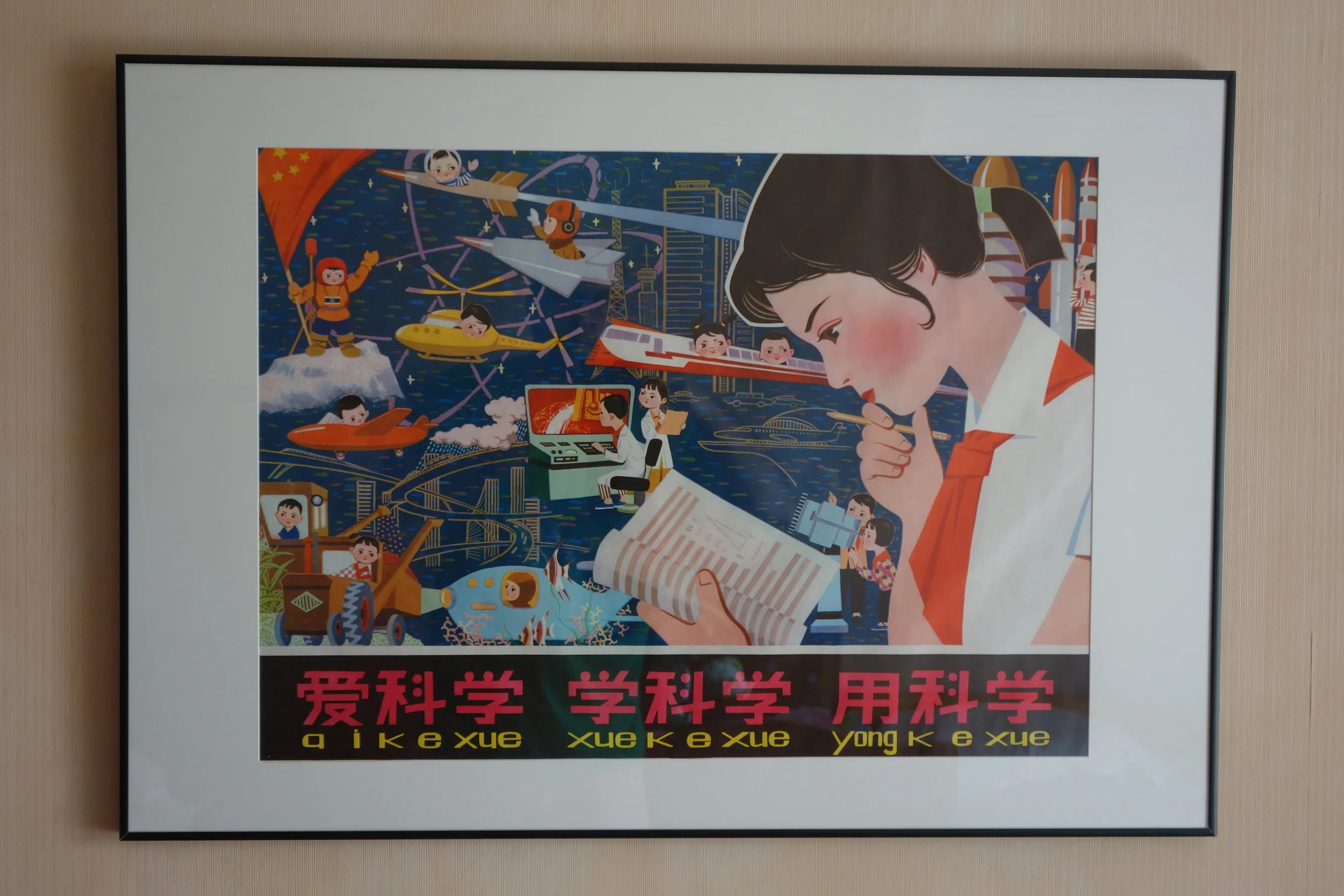 I finally got this old poster (from 1980) framed and hung in my daughter's room. It says Love Science, Study Science, Use Science 愛科學,學科學,用科學。